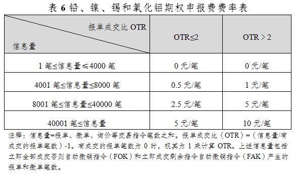 鉛、鎳、錫和氧化鋁期權對客戶信息量收取申報費,各品種收取标準一緻,如下表所示。